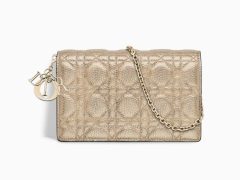 Lady Dior Wallet on Chain银色金属光泽藤格纹粒面触感小牛皮皮夹。