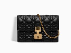 Lady Dior黑色藤格纹褶皱小牛皮Wallet on Chain皮夹,搭配复古金色金属D.I.O.R吊饰。