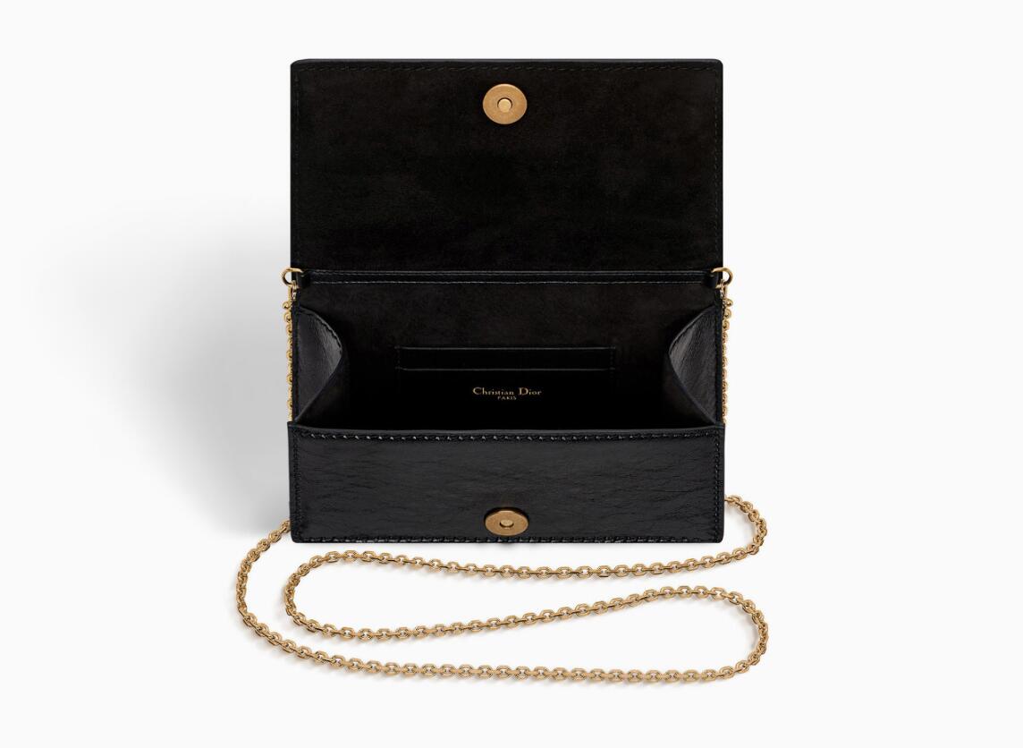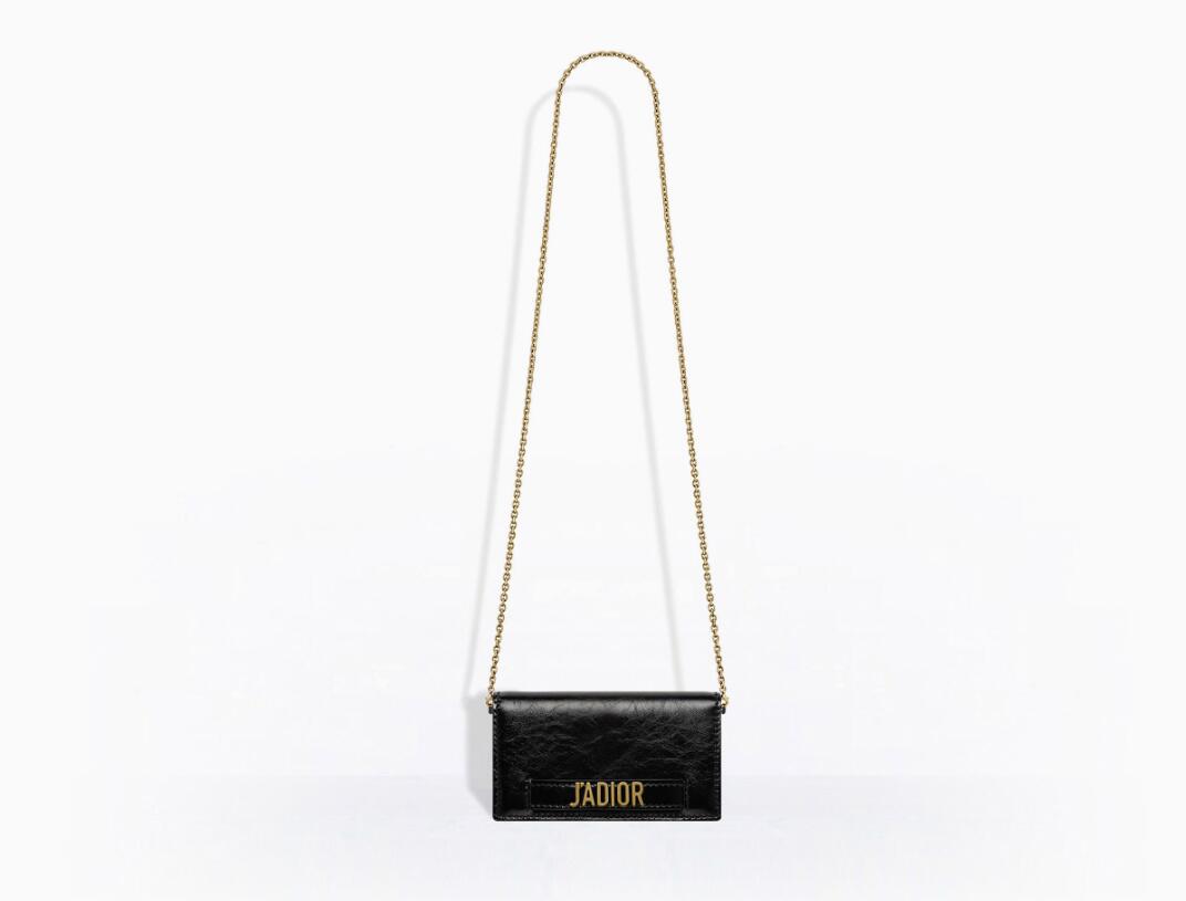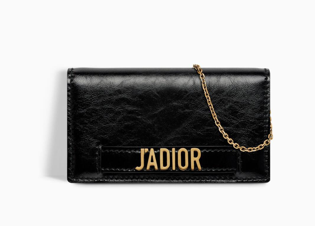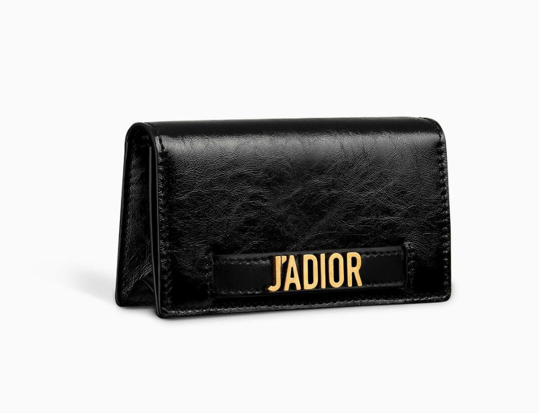 J’adior黑色褶皱小牛皮小皮夹,搭配提手和复古金色金属J’ADIOR标志。