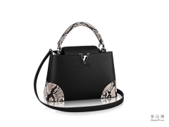 路易威登 Capucines 中号手袋 M42638 优雅的对比色设计,借鉴了摩洛哥式制皮工艺风格与2016春夏时装秀上的无指手套。独特的绳结饰边为此款大容量Capucines中号手袋增添一份成熟的个性魅力。
