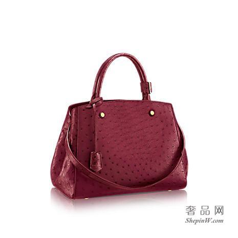 路易威登 MONTAIGNE 中号手袋 N91677 荧光粉色 位于巴黎金三色的蒙田大道是一个充满奢华时尚与商务气息的地方。 这款时尚的 Montaigne 手袋以华贵的珠光鸵鸟皮制成,是时尚商务女士们的完美之选。 该手袋拥有多种携带方式: 配有可脱卸包带,可手挽、手提或肩背。