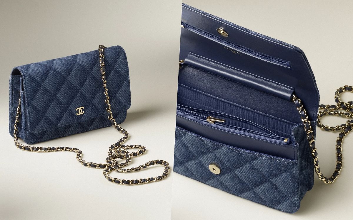 經典鏈子皮夾 印花牛仔布與金色調金屬