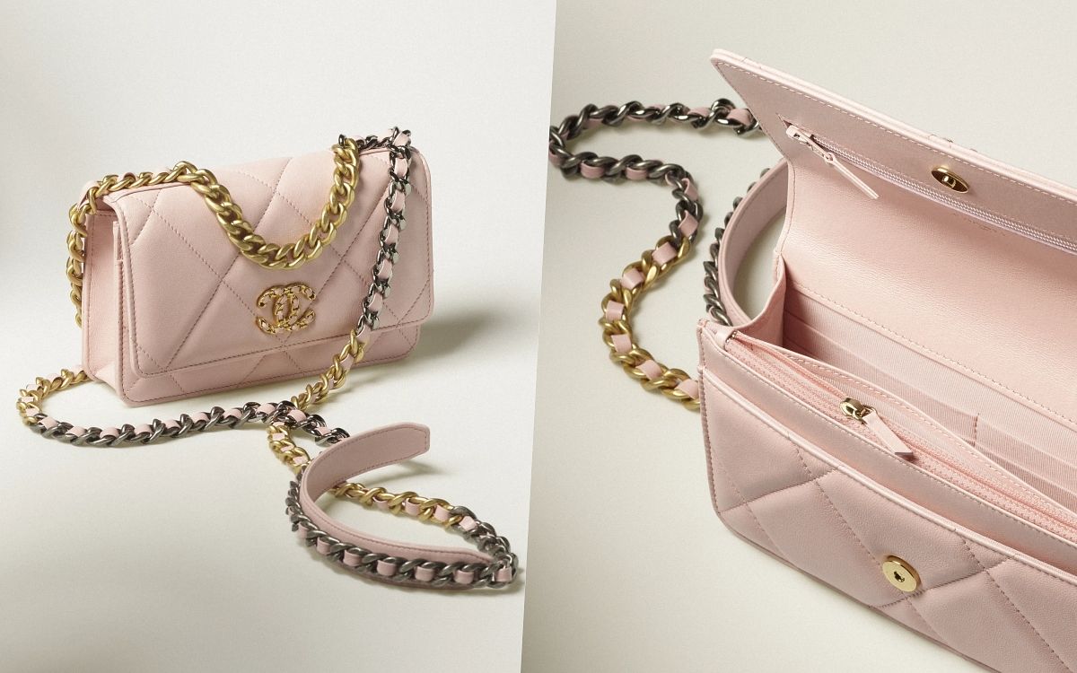 將CHANEL 19化身成超受歡迎的WOC包款,預算直接大減很可以,大格菱紋及雙色皮穿鏈與大型雙C LOGO,率性潮流的風格,搭上粉色調與柔嫩的小羊皮質感,在搭配上更加好上手,可鹽可甜超迷人。