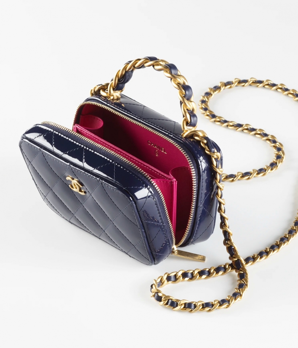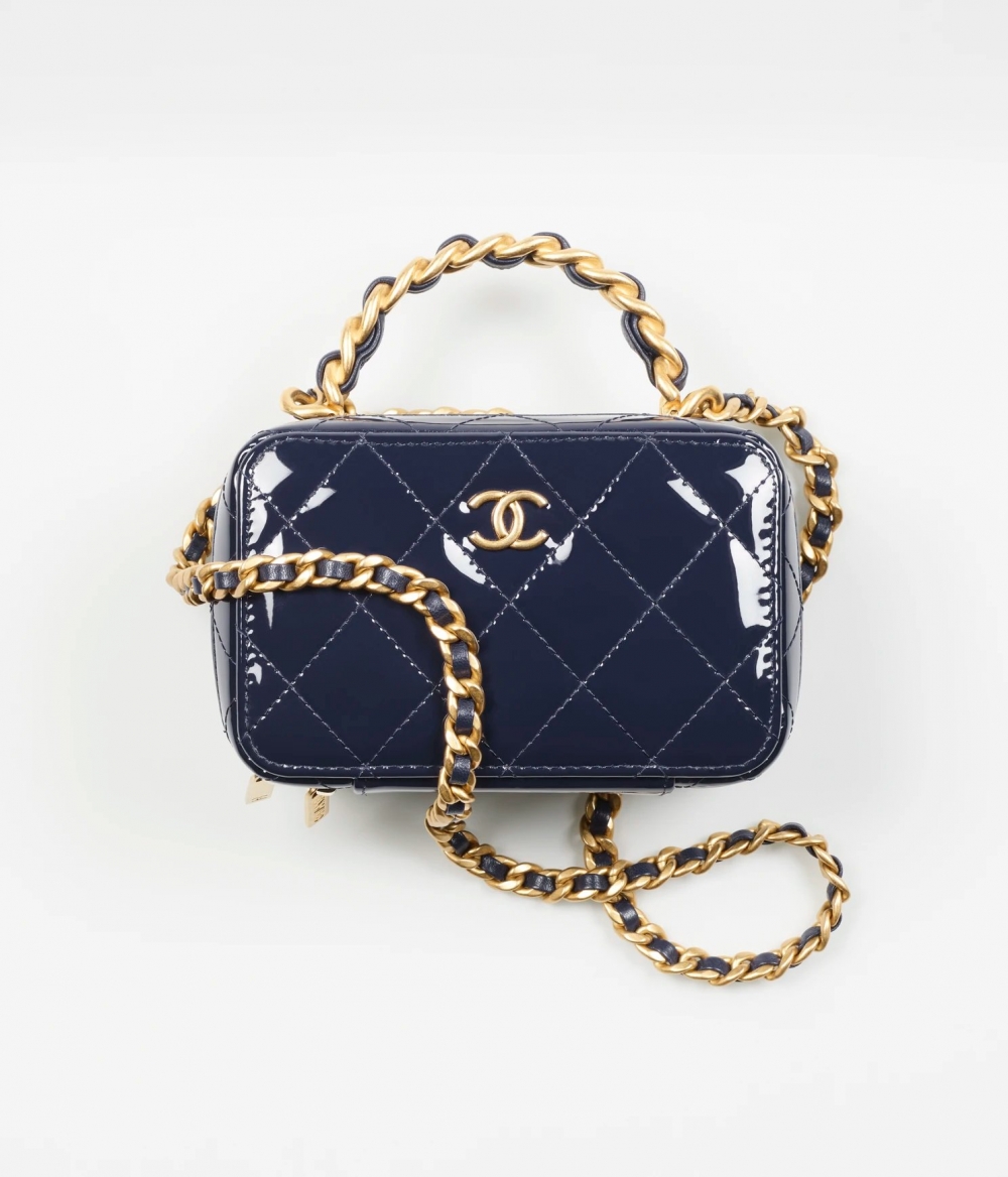 在設計中多加上手提把,不僅爲它增添貴族氣質,也多分幾分複古感。這款漆皮的海軍藍Vanity with Chain搭配上金色的雙C Logo與皮穿鏈,讓它格外典雅。尺寸爲14 × 9 × 6 cm,讓妳能收納壹些出門物件。