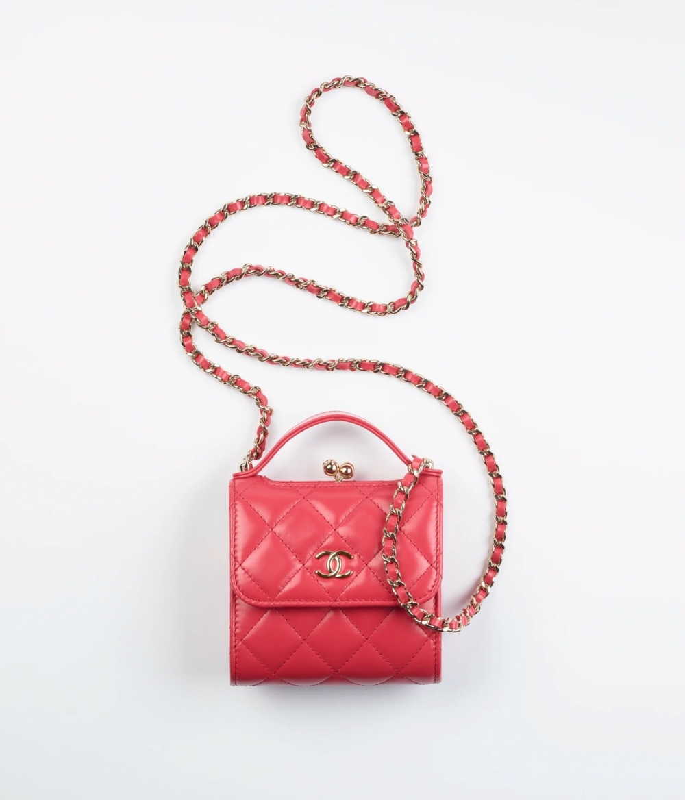 這款有著口金包設計與手提把設計的Clutch with Chain,搭配上鮮豔的紅色調更是迷人。尺寸爲12 × 11 × 5.5 cm,妳也能都稱它爲「時髦的行動零錢包」,在與姐妹好友們的聚會時都能戴上它。