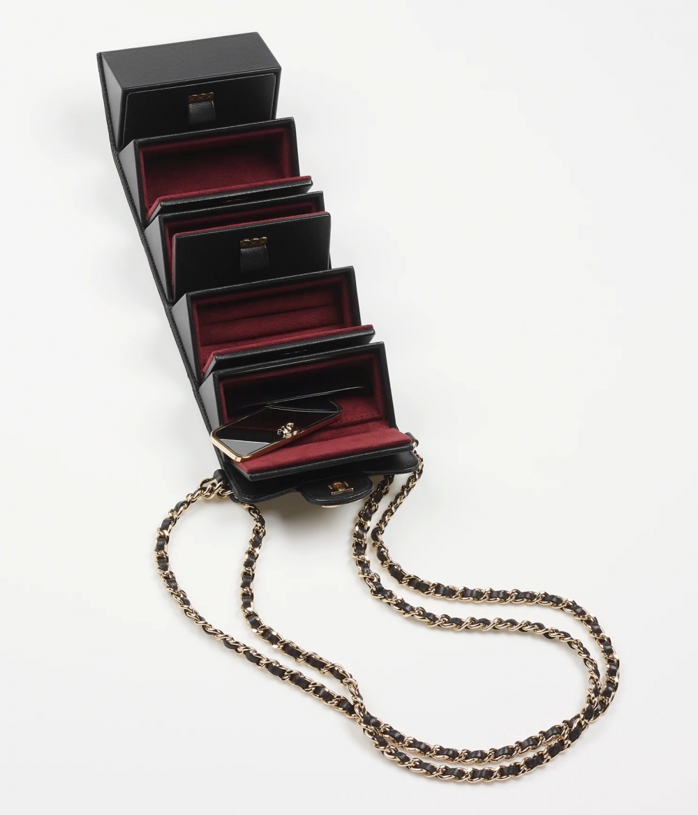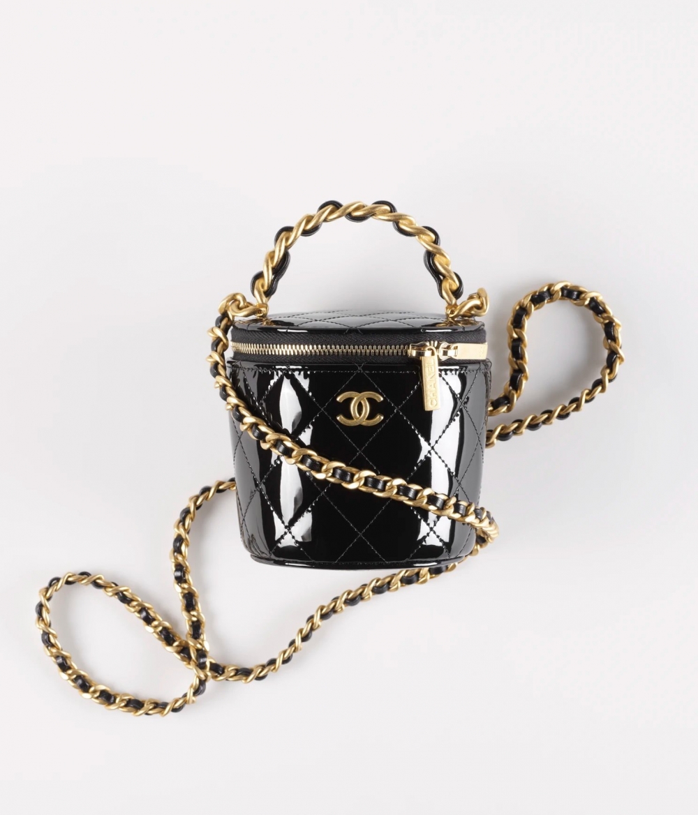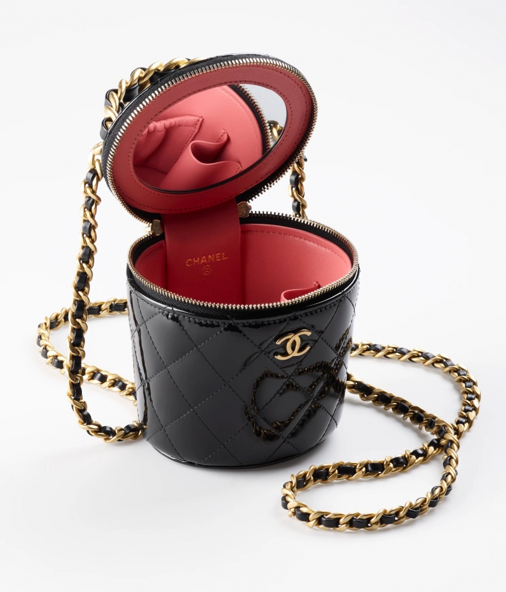 這款Vanity with Chain有著可愛的水桶設計,壹樣也是複古的手提把設計,這樣的「黑金」設計相當奢華耀眼。當妳將它打開來是還有見裏面附有壹個小圓鏡,讓妳能隨時隨地都能補妝。