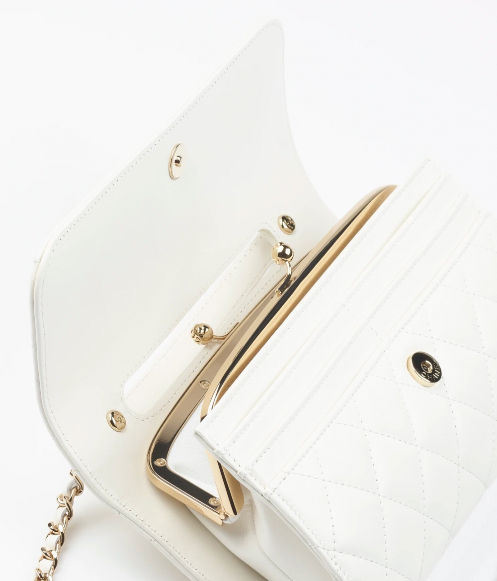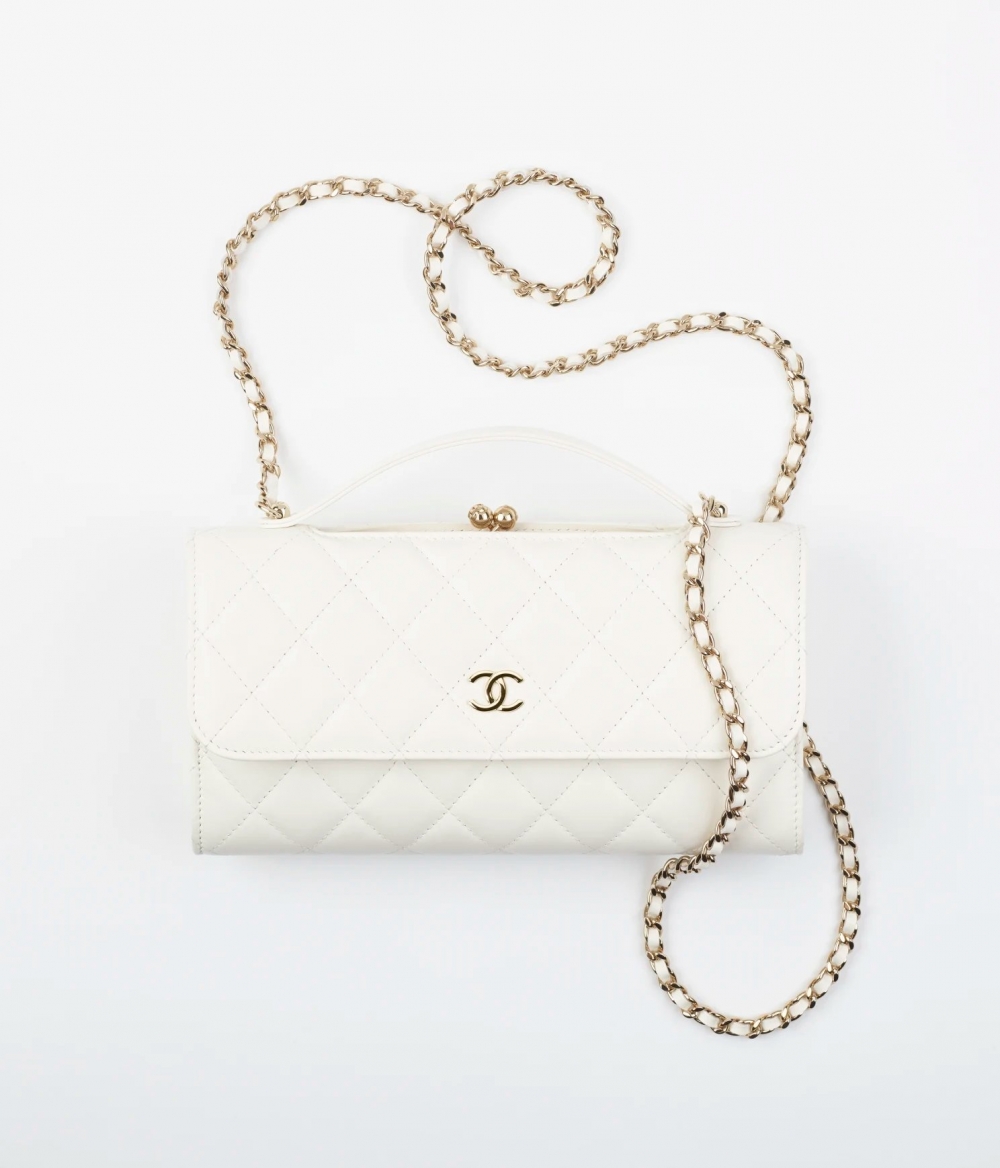 在日常中最常陪伴我們的手機也許妳也能爲它換上新家,對于出門常常只攜帶手機的讀者,或許也能投資這款Flap Phone Holder with Chain,純白的設計氣質又典雅。同樣有著在此系列中出鏡率極高的口金包與手提把設計,讓它格外別致。