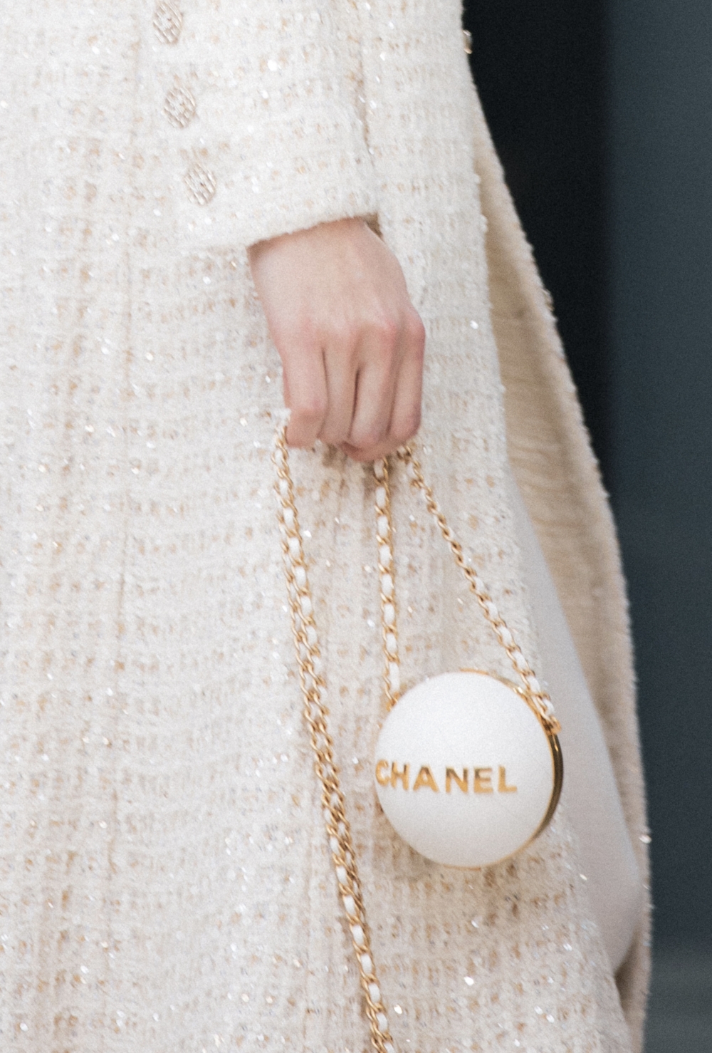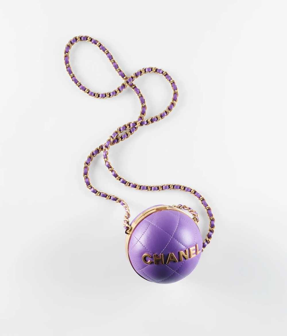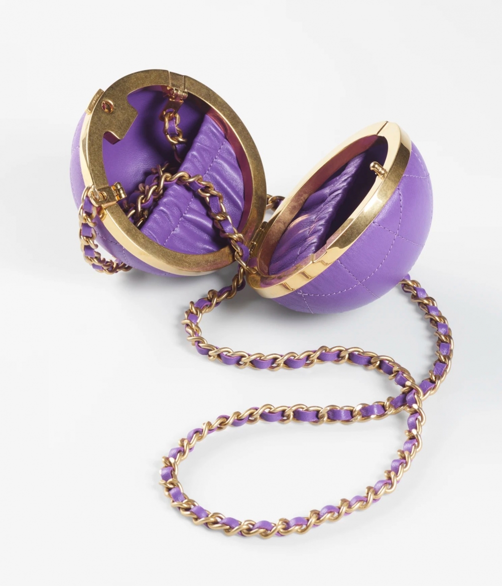 在秀場上登場的Sphere Minaudiere有著圓潤的球型讓它ㄧ出場就成爲大家關注的焦點。壹次推出兩款顔色,除了浪漫的薰衣草紫之外,還有如珍珠壹般的白色款式。兩款皆是搭配金色的金屬邊,以及具有儀式感的雙開設計,讓它更加高貴迷人。