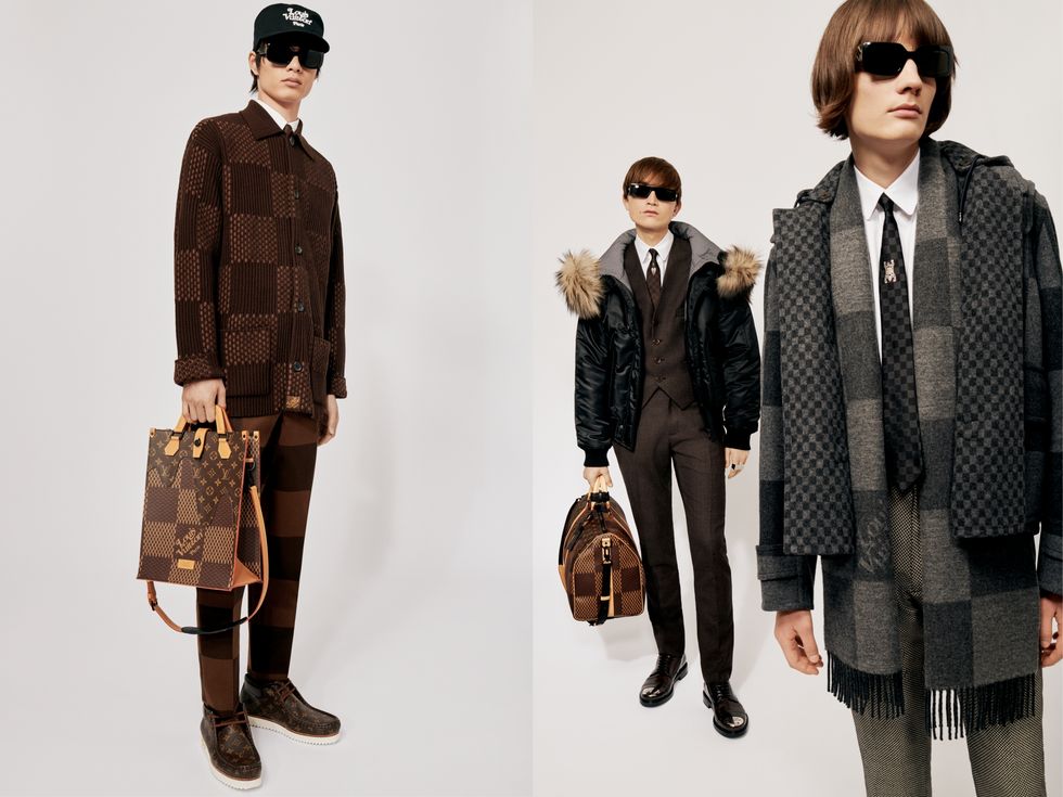 Mod剪裁西装採用路易威登Damier格纹,凸显其经典风格。此主题同时呼应在小格纹饰边的双面粗呢大衣,而黑色鱼尾连帽外套则彰显了结合华丽与运动的元素。