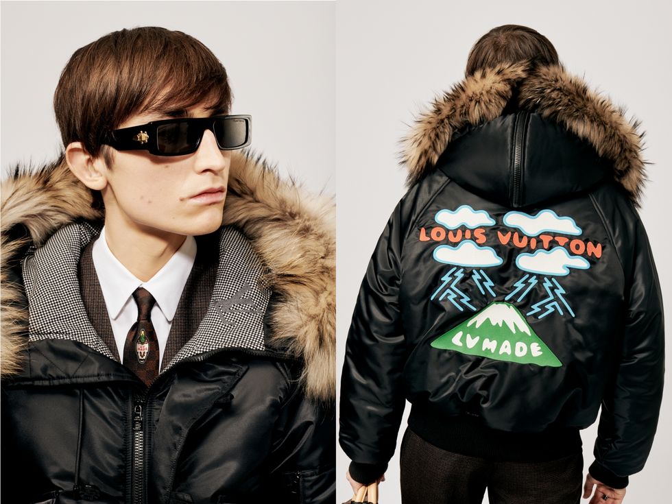 为了向Nigo创办的日本品牌Human Made致敬,这系列还有一件飞行员夹克上不仅饰有“LV Made”标志更搭配了富士山图像。