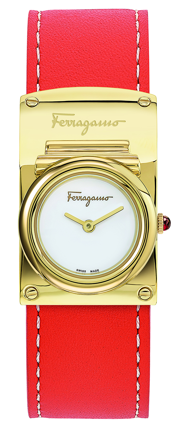 Double Gancini系列亦可搭配不同色彩的皮革表带,承托出小巧精致的矩形表壳,而银色日辉纹表盘以及镶有红色凸圆形宝石的表冠则倍添优雅气质。