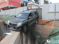 湖北大冶实验中学门口 越野车冲破施工护栏 险些掉进10米深坑